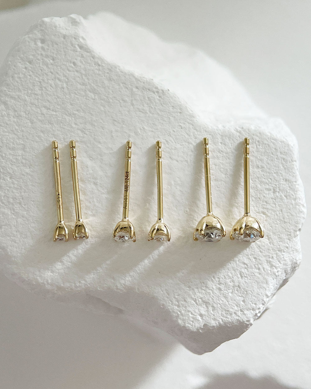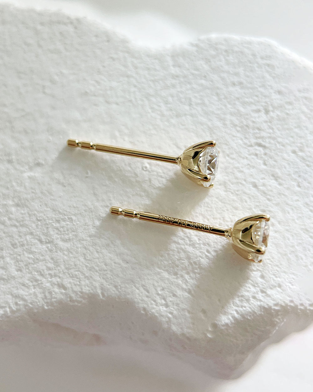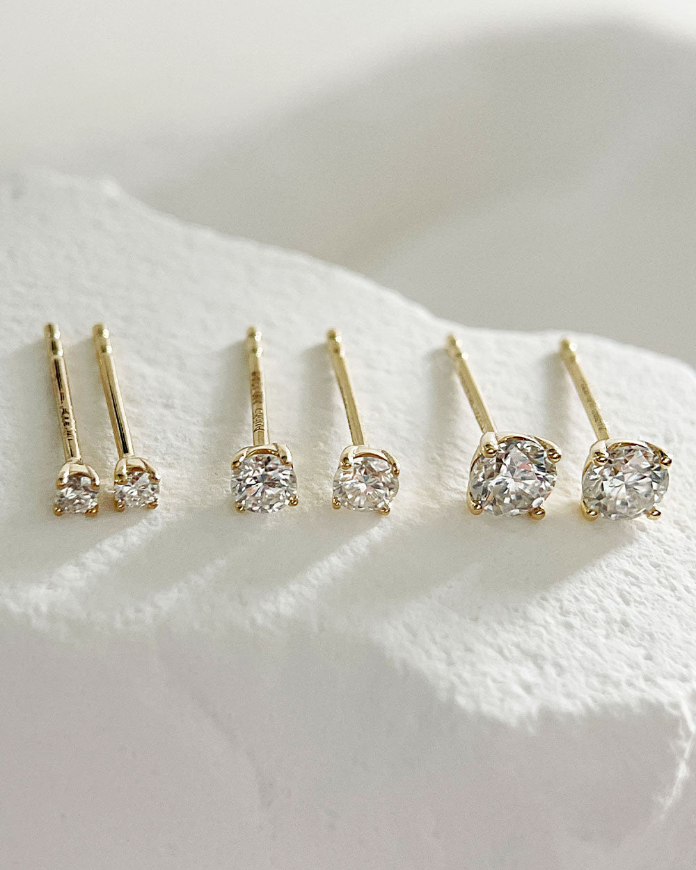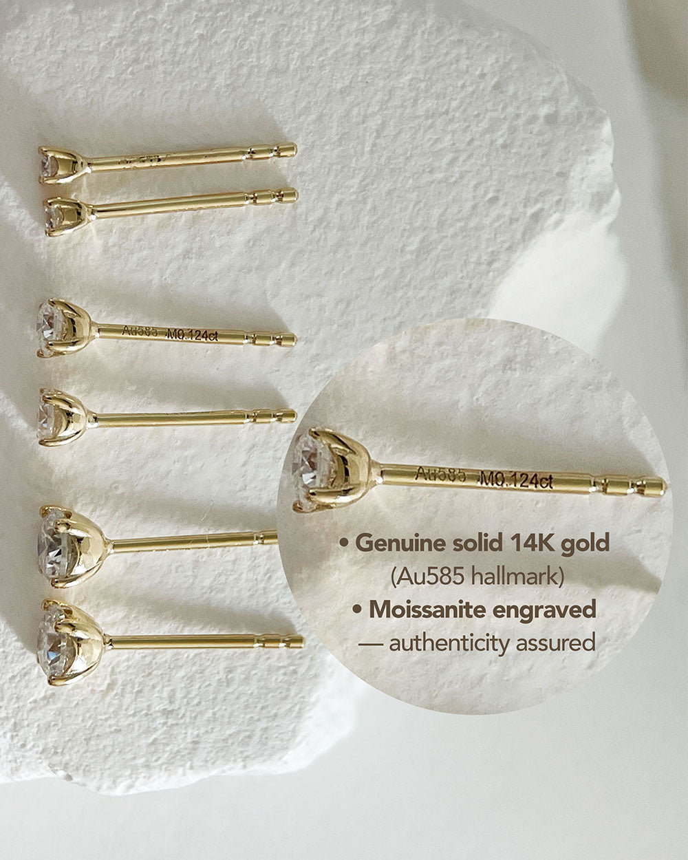 Each stud is laser-engraved with Au585 to certify genuine 14K gold, and MO + carat mark to verify the moissanite stone.