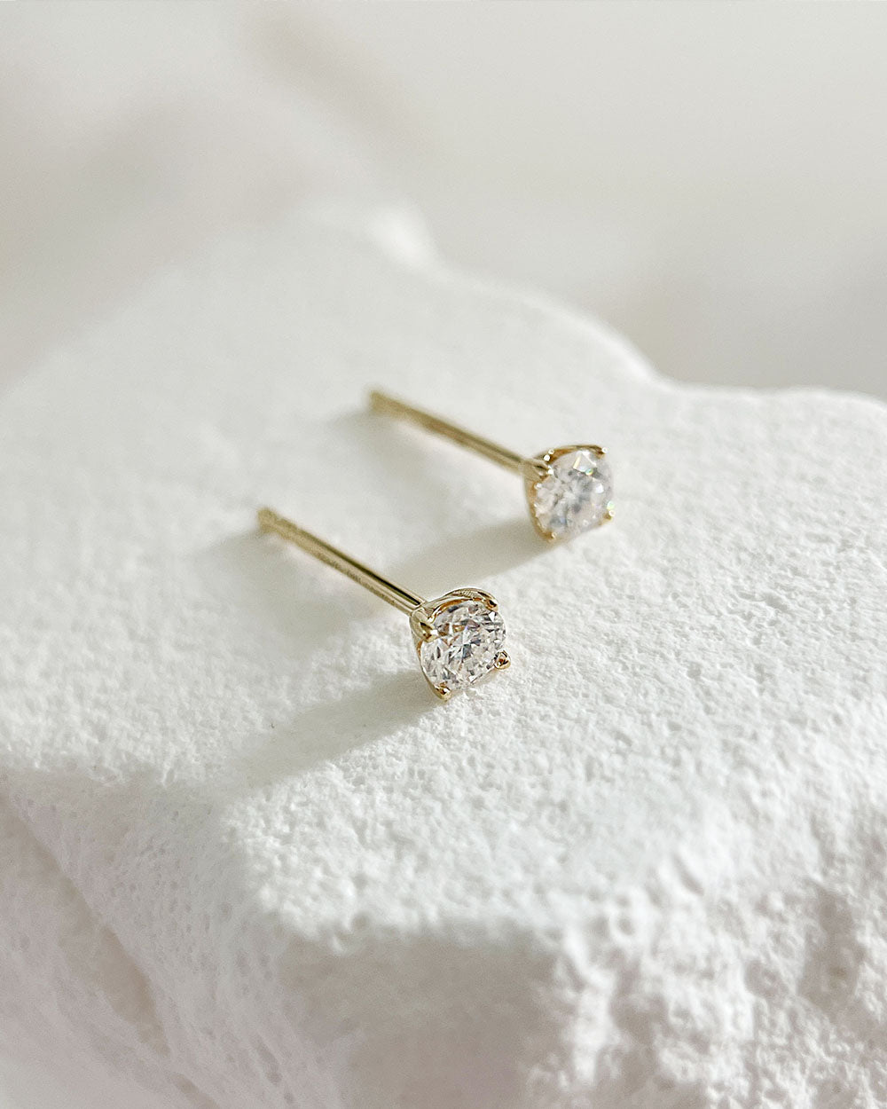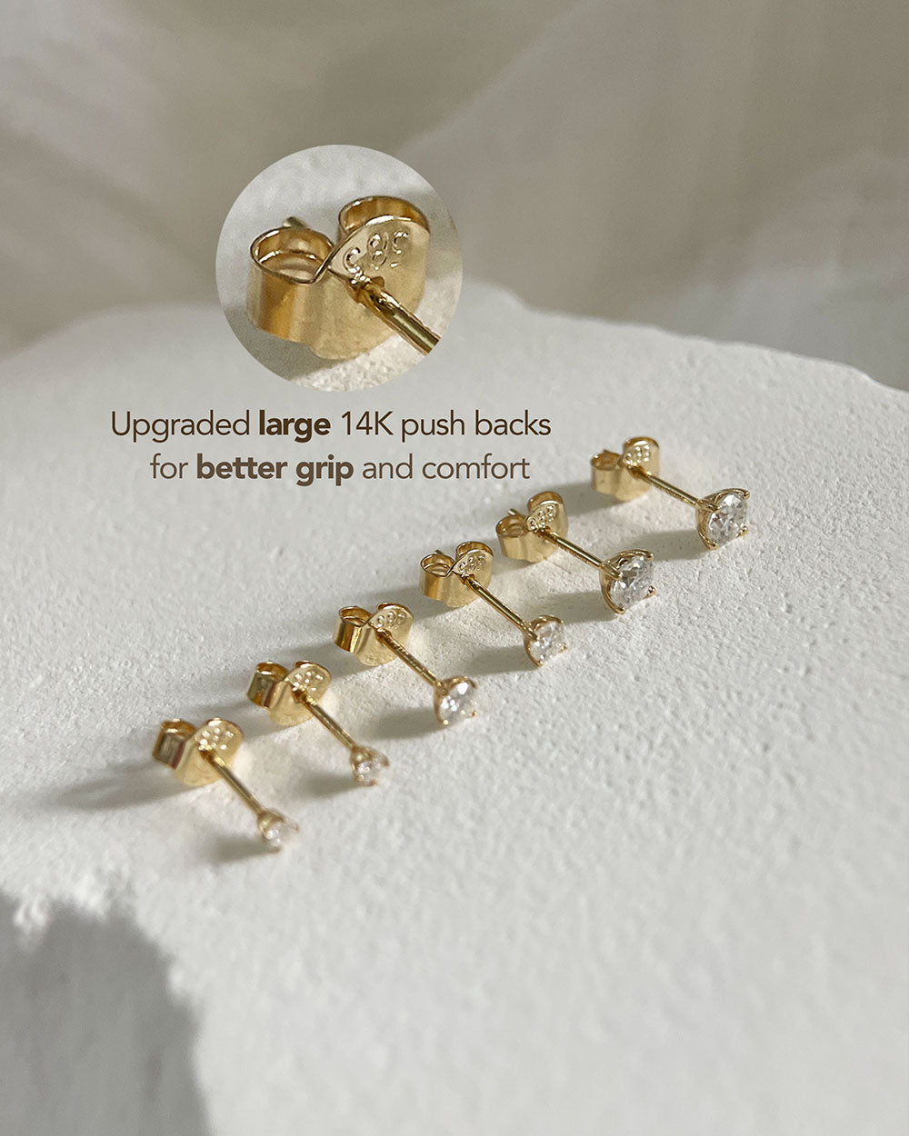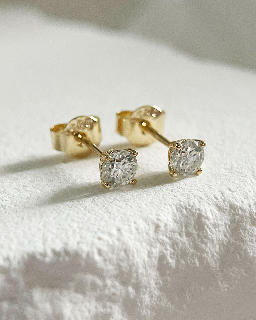 Each stud is laser-engraved with Au585 to certify genuine 14K gold, and MO + carat mark to verify the moissanite stone.